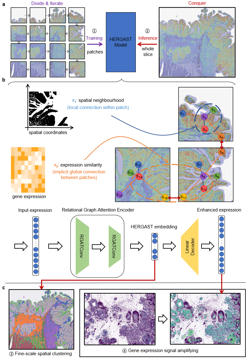 空间转录组学(ST)技术彻底改变了我们对组织内基因表达组织的理解,为细胞异质性和组织结构提供了宝贵的见解。近年来,空间转录组学技术正向高分辨率平台过渡,如Visium HD和Xenium,这大大增加了数据的大小和稀疏性,给描绘空间组织结构、识别细胞类型和检测空间特异性基因表达带来了计算上的挑战。现有的计算方法在处理这些超大规模和超高分辨率技术产生的数据时,往往会遇到计算效率低、内存消耗大、过平滑以及生物信号稀释等问题。因此,该研究提出了HERGAST (High-resolution Enhanced Relational Graph Attention Network for ST),一个用于超大规模和超高分辨率空间转录组数据中空间结构识别和信号放大的系统,用于克服现有空间组学计算方法的局限性。