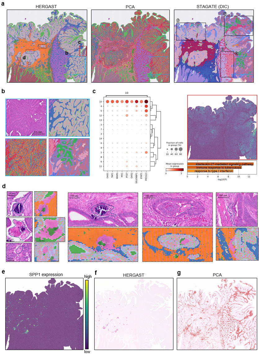 结直肠癌(CRC)具有复杂的肿瘤微环境,在疾病进展和治疗结果中起着关键作用。对于Visium HD技术获得的一份包含超过54万个spots的结直肠癌切片数据进行分析。结果显示,HERGAST能够更平滑、更精细地描绘出肿瘤基质区域,并将其与肿瘤区域区分开来。此外,HERGAST在肿瘤区域内识别出了一簇独特的SPP1+巨噬细胞,这些细胞围绕在钙化区域周围。SPP1+巨噬细胞在肿瘤微环境中起着至关重要的作用(图3d-g)。HERGAST的这一发现凸显了其在解读复杂空间组织和揭示肿瘤区域内异质性方面的优势。