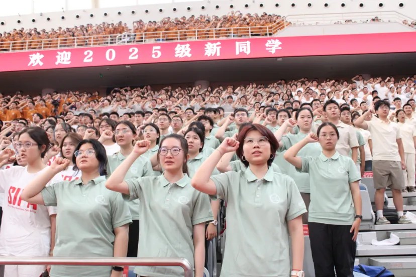 在领誓人的带领下,同学们庄严宣誓,为自己即将到来的大学生活许下铮铮誓言。