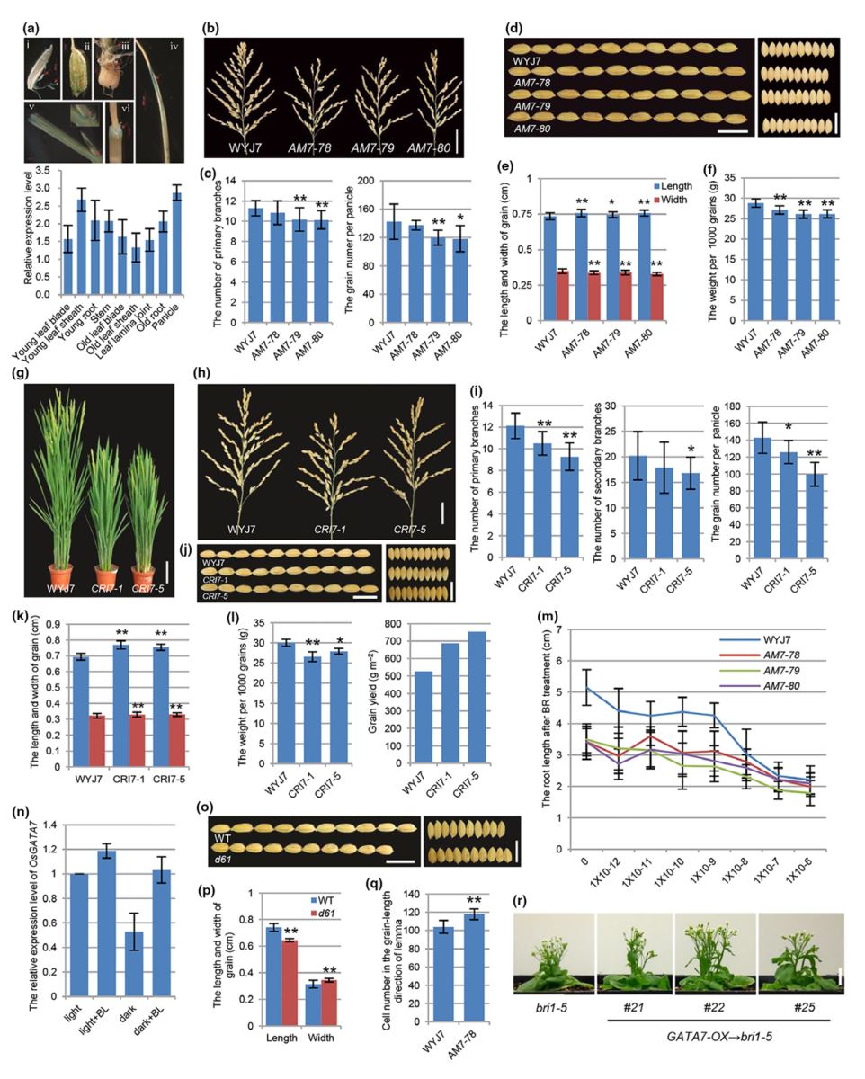 Rice (Oryza sativa) is the most important crop and feeds more than half of the world population. The architecture of rice, including height, leaf inclination, and tiller number, is important for rice planting and yield. Plant hormone, brassinosteroids (BR), plays crucial roles in modulating plant architecture and seed yield. But BR cannot be applied in agriculture production directly because BR regulated multiple processes and could not be transcriptional regulated in different tissues. BR deficiency/insensitivity leads to decreased reproductivity and grain yield. Enhanced BR signaling contributes to better nutrition, higher efficiency of carbohydrate transportation from source to sink, and increased grain yield. But the increased plant height and leaf inclination induces lodging and reduces planting density. The solutions of side-effect is identifying new regulators which can mediate parts of BR-regulated rice growth. Currently Prof. Wen-Hui Lin and her group identified a new GATA transcription factor, OsGATA7, which modulated BR-mediated growth regulation in architecture and grain shape. The knock down and genome-edited (CRISPR-CAS) lines of OsGATA7 had decreased height and leaf inclination, and slightly decreased grain number per panicle and grain weight, which was similar to BR-deficient and BR-insensitive mutants. Overexpression of OsGATA7 could partially rescue phenotypes of Arabidopsis BR-insensitive mutant bri1-5, further suggesting that OsGATA7 partially modulated BR-mediated plant growth in some processes. The results also showed that although the yield per plant was slightly decreased, the increase plant density was expected to increase total rice yield per unit area.