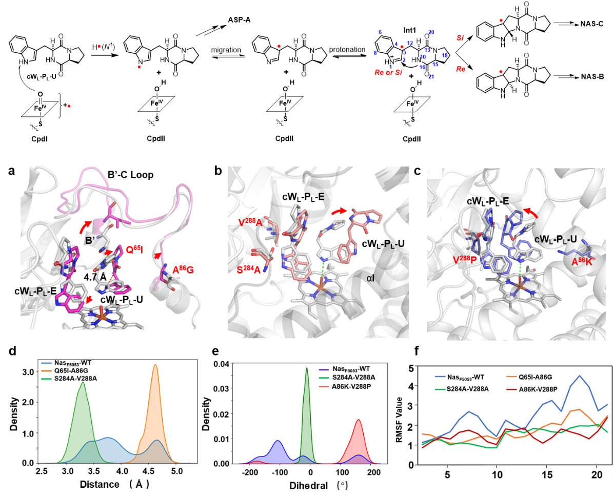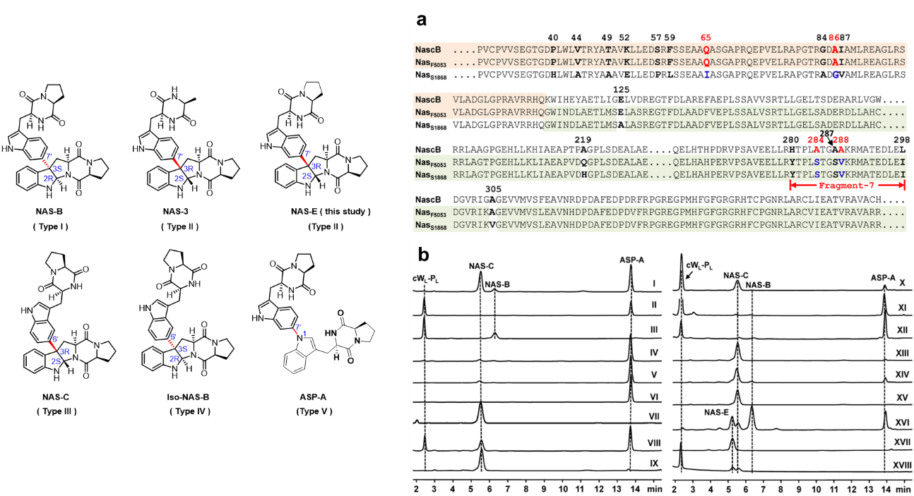 Bacterial heterodimeric tryptophan-containing diketopiperazines (HTDKPs) are a growing family of bioactive natural products. They are challenging to prepare by chemical routes due to the polycyclic and densely functionalized backbone (Figure 1A). Through functional characterization and investigation, the researchers herein identified a family of three related HTDKP-forming cytochromes P450 (NasbB, NasS1868 and NasF5053) and revealed four critical residues (Qln65, Ala86, Ser284 and Val288) that control their regio- and stereo-selectivity to generate diverse dimeric DKP frameworks. Engineering these residues can alter the specificities of the enzymes to produce diverse novel frameworks (Figure 1B).