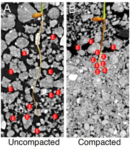 Hard (compacted) soils represent a major challenge facing modern agriculture that can reduce crop yields over 50% by reducing root growth, causing significant losses annually. Soil compaction triggers a reduction in root penetration and uptake of water and nutrients (Figure 1). Despite its clear importance for agriculture and global food security, the mechanism underpinning root compaction responses has been unclear until now.