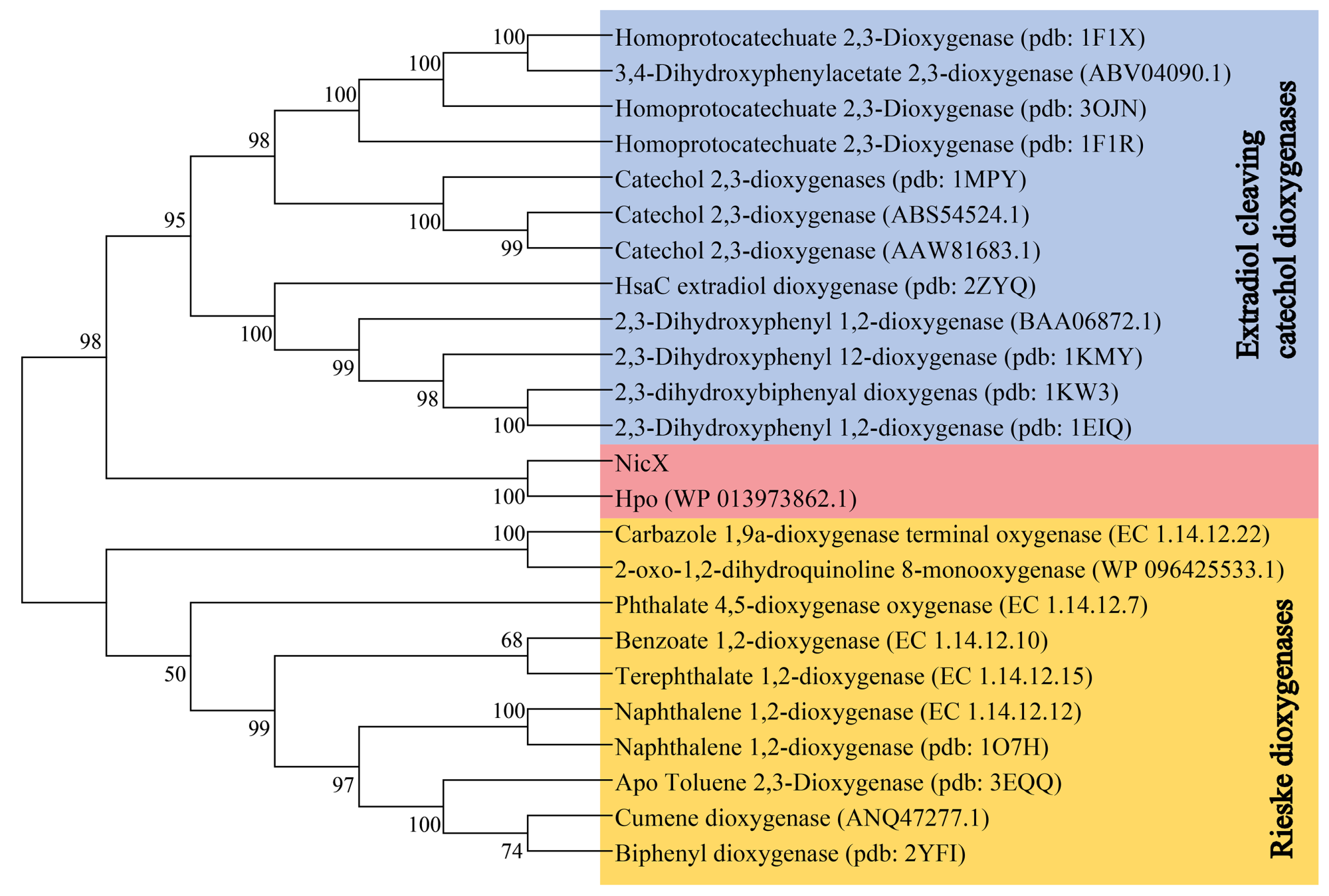 Figure 1. Phylogenetic analysis of NicX. Phylogenetic tree of NicX with selected dioxygenases constructed by using neighbor-joining method. GenBank accession numbers or pdb numbers are shown at the end of each name. Bar represents 1.0 amino acid substitutions per site.