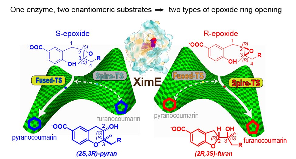 Computational biochemists have unveiled an unprecedented dichotomy in enzymatic catalysis, in which two enantiomeric substrates bind XimE in two distinct fashions and give two different epoxide ring opening products! Is there Baldwin’s Rules or something else? Obviously, there is no simple rule for the pyranocoumarin and furanocoumarin formation.