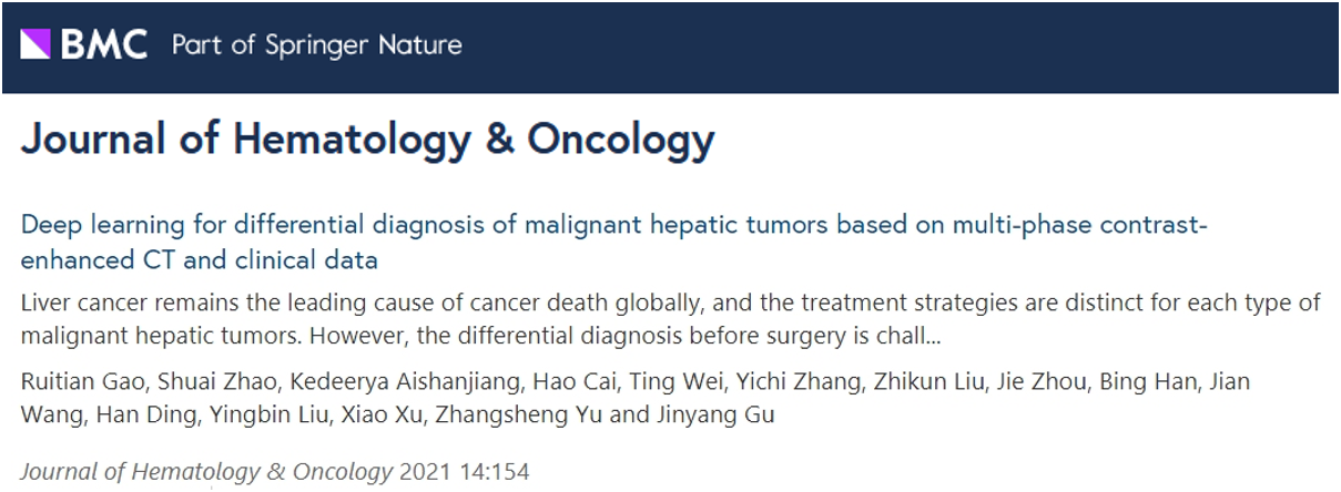 Recently, Prof. Zhangsheng Yu from the School of Life Sciences and Biotechnology (SLSB), Shanghai Jiao Tong University, published a paper in Journal of Hematology & Oncology in collaboration with researchers from Xinhua Hospital Affiliated to Shanghai Jiao Tong University School of Medicine, Renji Hospital Affiliated to Shanghai Jiao Tong University School of Medicine and Hangzhou First People’s Hospital Affiliated to Zhejiang University School of Medicine, titled Deep learning for differential diagnosis of malignant hepatic tumors based on multi-phase contrast-enhanced CT and clinical data. In this paper, the researchers built an automatic diagnostic model for differentiating malignant hepatic tumors based on patients’ multimodal medical data including multi-phase contrast-enhanced CT and clinical features.