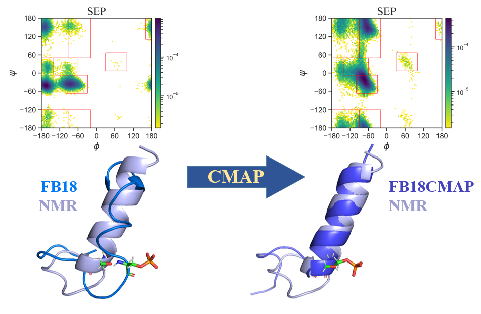 Here, a new force field parameter (named FB18CMAP) is generated by fitting against quantum mechanics (QM) energy in aqueous solution with φ/ψ dihedral potential-energy surfaces optimized using CMAP parameters. The results of MD simulation for phosphorylated dipeptides, intrinsically disordered proteins (IDPs), and ordered (folded) proteins show that FB18CMAP can better reproduce NMR observables than the FB18 force field (Figure 2). These findings suggest that FB18CMAP performs well in both the simulation of ordered and disordered states for phosphorylated proteins.