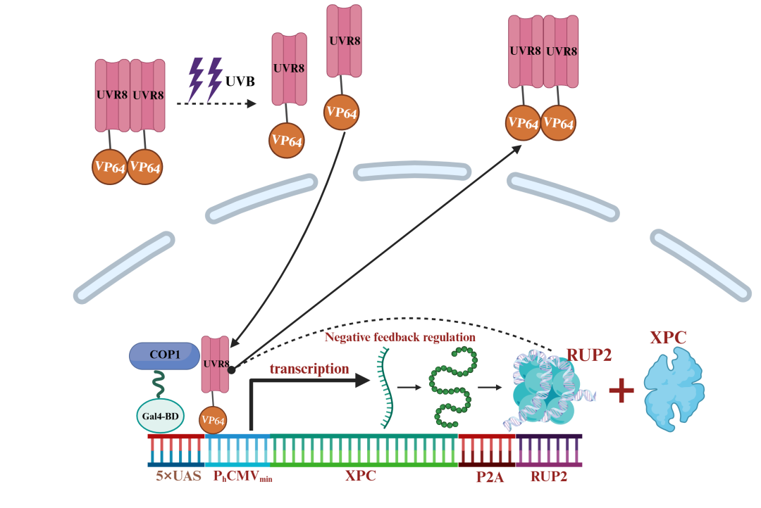This year, the SJTU-BioX-Shanghai team focused on health and disease treatment. Xeroderma pigmentosum (XP) is an autosomal recessive genetic disorder reported in nearly all racial groups across continents. Patients are highly sensitive to ultraviolet radiation B (UV-B), with sun-exposed areas prone to blisters, epidermal hyperplasia, and tumors. Two-thirds of patients die before age 20, and there is currently no cure for XP. The team members focused on the most common type, Xeroderma pigmentosum complementation group C (XPC), which is caused by mutations in the XPC gene leading to abnormal DNA repair proteins and inability to repair UV-B-induced DNA damage. Inspired by a UV-responsive system in plants, the team decided to design a novel UV-responsive gene switch to achieve controlled expression of the XPC gene in patients, converting pathogenic UV-B into therapeutic UV-B.