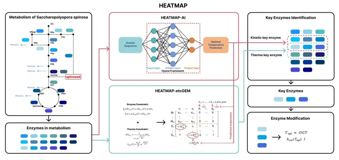 Therefore, the team's project, "HEATMAP: Harmonizing Enzymatic Activity and Temperature in Metabolic Pathways," uses an AI model named HEATMAP-AI to predict the optimal temperatures of enzymes and establishes the etcGEM model to simulate the metabolic pathway for spinosad production in Saccharopolyspora spinosa. By combining these two models, the team identifies key enzymes limiting reaction rates in the production process. These enzymes are then further directed to evolve, making their optimal temperatures closer to reaction temperatures, thereby improving spinosad purity, unit production, reducing costs, and expanding market influence.
